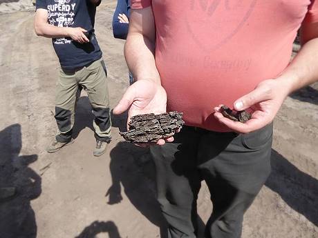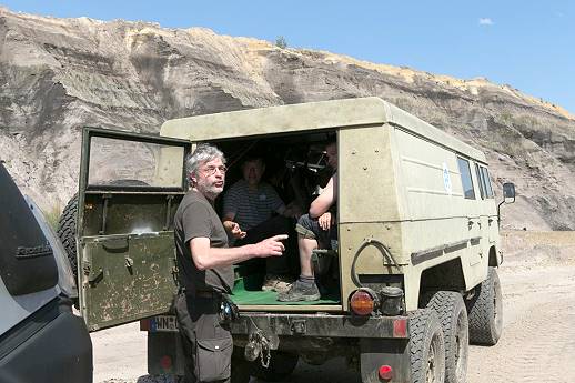 Oliver referiert einiges zur Entstehung der Kohleflöze vor 15 bis 20 Millionen Jahren aus riesigen Torfmooren und erklärt die moderne Abbaumethode mit den gigantischen Schaufelbaggern und dem aufwändigen Handling der Sandmassen. Die 20 bis 30 Meter hohe Deckschicht aus angewehtem Nordseesand muss erst weggeschoben und beiseite gelegt werden. Nach Entnahme der Kohle kommt sie wieder in das Bauloch und wird bis zur vorherigen Höhe aufgefüllt. Der Volumenverlust durch die entnommene Kohle wandert größer und größer werdend weiter mit der Förderlinie und bleibt zum Schluss als riesiges Loch zurück, das sich mit Regenwasser füllt und in 20 Jahren ein schöner See werden soll.