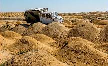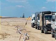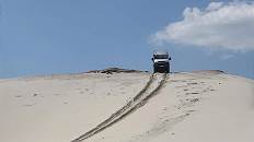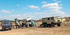 Wir wenden uns wieder dem Gelände zu und finden auf diesen ganz frisch bearbeiteten Flächen interessante Ausblicke und sandige Herausforderungen: Der Hügel dort sieht aus wie eine Weichsanddüne in der Sahara und fährt sich auch so. Bergauf ist es mangels Traktion für unsere Boliden unmöglich, sie würden sich bis zur Achse eingraben und keinen Meter gewinnen. Nur der Volvo 6x6 kommt über eine ähnliche Stelle ohne Schwung hinüber: Mit sechs zwar durchdrehenden, aber doch langsam Vortrieb schaffenden Rädern ...