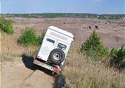 Der Stress ist vorbei, so glauben wir, denn nun geht es über leichtes Gelände dem Übernachtungsplatz entgegen. Aber besonders waagerecht sind auch die letzten Meter der Piste nicht und wenn sich der schmale und hohe Gwenn seitlich neigt, meint man immer, jetzt fällt er gleich um. Aber das täuscht, oben rum ist das Gefährt sehr leicht und unbeladen ...