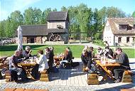 Schlussakkord: An der Krabat-Mühle kehren wir ein, nehmen ein vom Veranstalter organisiertes Abendessen ein und diskutieren noch lange über die Erlebnisse der letzten beiden Tage. Auch mit Reto und Gaby, die ihren Bremach wegen Lenkungsschaden stehen lassen mussten, gibt es ein herzliches Wiedersehen. Dann werden wir von einer Frau in sorbischer Tracht durch die Anlage geführt und erfahren von ihr allerlei Wissenswertes über die Sorben, eine slawische Minderheit in Deutschland, und auch über die Mühle, eine Art Heimatmuseum zum Thema der inzwischen verfilmten Romanfigur Krabat und seinem bösen Meister, dem Schwarzen Müller ...