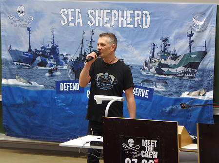 Zum Auftakt wird seitens der Veranstalter auch Captain Alex Cornelissen (Sea Shepherd Global Director) begrüßt, der von den Zuschauern frenetisch empfangen wird. Danach kommt das Programm schnell zur Sache: Nach einer allgemeinen Vorstellung der Sea Shepherd Conservation Society (SSCS) als internationaler, gemeinnütziger Meeresschutzorganisation kommen wie angekündigt als erstes die aktuellen Kampagnen gegen japanische Wal- und färingische Delfinschlächter zur Sprache. Ein Thema, bei dem die Veranstalter an manchen Stellen den Eltern mit Kindern im Saal raten, aufgrund der dabei gezeigten Bilder ihre Kinder vorübergehend aus dem Raum zu bringen.