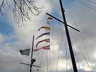 Wir schreiben den 27. November 2018: Die pacifico ist inzwischen fertig für den kommenden Weihnachtsmarkt in etwa einer Woche vorbereitet: Sie soll dort wie schon in den Vorjahren wieder als Tierschutzschiff die Besucher über Mensch, Tier und Umwelt/Natur informieren. Die gesetzten Flaggen zeigen am hinteren Besanmast die Flagge der Meeresschutzorganisation Sea Shepherd. Am Hauptmast wird das internationale Rufzeichen der pacifico, DA5644, mit den entsprechenden Buchstaben- und Zahlenflaggen gezeigt ...