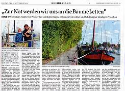 Wir wurden vor etwa einer Woche im Hafen und in der Innenstadt von Weener zu den Bäumen angesprochen. Ihr seid das Tierschutzschiff, ihr müsst etwas unternehmen, weil am Hafen alles an Bäumen bis zur Schleuse gefällt werden soll. So fing das an. Zusammen mit der Ostfriesen-Zeitung wurde dann recherchiert. Alles sollte wohl geheim gehalten und in einer nicht angekündigten Aktion von EWE (der hiesige Energieversorger) und der Stadt Weener durchgezogen werden. Nun wurde schnell zurückgerudert. Kommentar des Bürgermeisters: `Das ist Sache der Firma EWE und geht uns nichts an.´ Mal sehen, wie´s weiter geht. Alle Menschen hier stehen nun hinter uns. Bis auf den Hafenmeister."