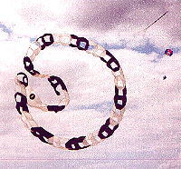 Denn an einem Drachen kann so allerlei festgemacht werden. Z.B. drehende Windsäcke (Windturbinen), Rotoren usw. oder wie im folgenden Bild diese prachtvolle Knüpferschlange, benannt nach dem Bremer Erfinder Bernd Knüpfer.