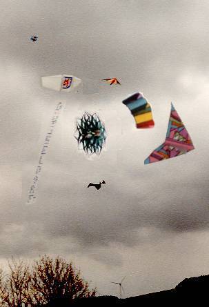 Der Wind schwankt stark, so dass vom OKD über Rokkakus und Flocken bis hin zu unserem Black Opal alles irgendwann seine optimalen Flugbedingungen bekommt. Bei den Teilnehmern kommt keine Langeweile auf, da ständig ein Drachen landet und der andere wieder zuviel Zug kriegt oder eine Karambolage im letzten Moment noch verhindert werden muss. Die Lenkdrachen-Freaks können sich auf einer eigenen Wiese austoben und kommen sich somit mit den Einleinern nicht ins Gehege.