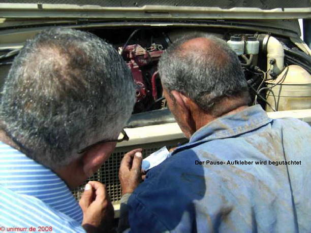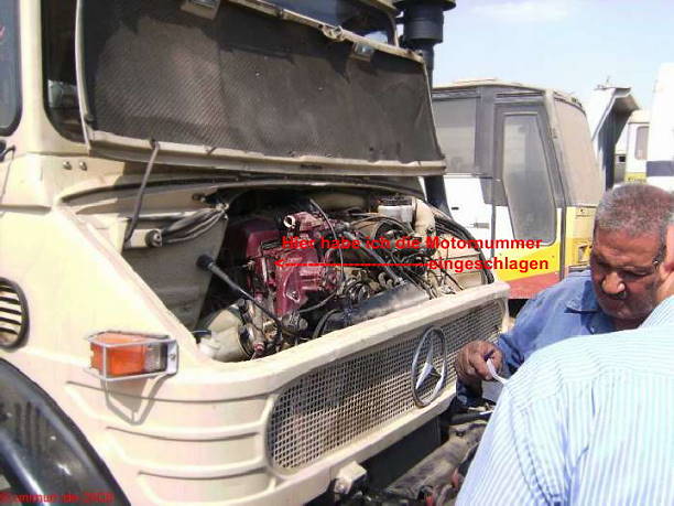 Nach einer sehr langen Fahrt in einen nordöstlichen Außenbezirk erreichten wir das Zollgelände. Das entpuppte sich als ein trostloser Hof voll mit Autowracks aller Größenordnungen, die mit einer dicken Patina von Staub und Dreck der dicken Luft Kairo´s überzogen waren. Vom PKW bis zum 60 t Sattelzug reichte die Palette und von technisch Schrott bis brauchbar. Jedes dieser Wracks könnte wahrscheinlich eine spannende Geschichte erzählen. Auf diesem Hof wurde nun zum wiederholten Mal die Fahrgestellnummer und die Motornummer des Unimog´s erfasst. Dazu klebt der Nummernbeauftragte ein selbstklebendes Etikett 80x30mm auf die eingeschlagene Nummer und paust sie mit einem Bleistift ab.