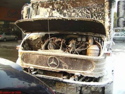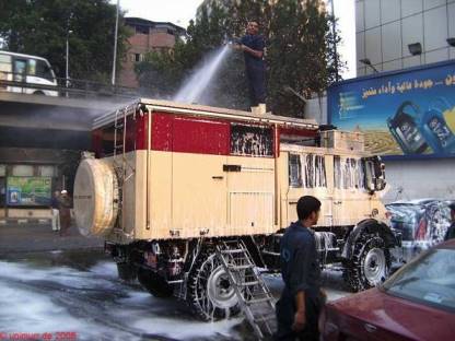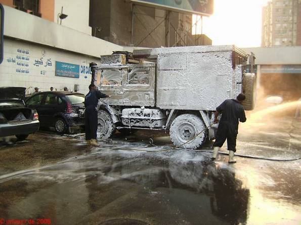 Also machte ich mich am Freitagnachmittag zur nahe gelegenen Tankstelle auf, um den Unimog vom Dreck der Kairoer Luft und vom Staub des Sinai zu befreien. Dort ist ein sehenswertes Schauspiel zu bewundern: Die zu waschenden Fahrzeuge werden zuerst mit einem Wasserschlauch nass gespritzt. Darauf kommt ein Fahrzeugkosmetiker mit einem anderen Schlauch, aus dem dicker, weißer Schaum quillt. Damit wird das Auto bis zur Unkenntlichkeit eingeschäumt. Während ich das alles so betrachte, sehe ich wie meine Fahrertür auf geht. Von böser Vorahnung getrieben, spurte ich um den Unimog herum und kann gerade noch verhindern, dass er auch den Innenraum einschäumt ...