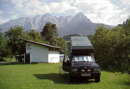 Wir sind auf einem angenehmen Campingplatz angekommen, wo wir den Explorer direkt am Ufer der Salzach mit einem malerischen Ausblick auf das Tennengebirge parken können.