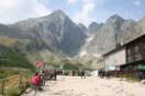 Tage später an der Hohen Tatra: Auf dem Campingplatz von Stara Lesnoy wollen wir die Eurotour dokumentieren und auch den nahen 2.655 m hohen Gipfel der Hohen Tatra besuchen. Ein Bus bringt uns für 50 Cent nach Lomnica. Die Preise für die Tickets bis zum Gipfel sind stattlich: 33,- EUR pro Person sind fällig. Für die Bahn auf den Gipfel erhält man eine Zeitvorgabe: Damit wird die Auslastung der Bahn gesteuert. Wir dürfen erst um 15:20 Uhr auf den Gipfel. Derweil kann man mit kleinen Sesselliftgondeln zur Zwischenstation auf 1.700 m fahren. Dort befindet sich eine astronomische Station und eine Wirtschaft mit Preisen, die sehr unslowakisch sind: Kostet unten im Tal ein Bier ca. 1,- EUR, so muss man hier 2,20 EUR bezahlen. Zurück in Lomnica findet man zahlreiche Lokale und wir probieren "Mamas Küche" aus, wo das Essen gut und wie üblich deftig ist. Von Lomnica aus fahren wir mit dem Zug die eine Station nach Stara Lesnoy zurück, was pro Person ganze 32 Cents kostet ...