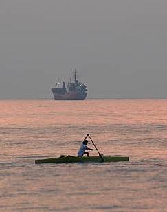 Der Campingplatz erstreckt sich an der südlichen Seite der Halbinsel Milje/Muggia direkt an der Küste. Man ist hier stolz auf sein "mediterranes Flair", das der Platz in der Tat nicht nur in der Beschreibung ausstrahlt, auch wenn man nur enttäuscht sein kann, falls man wie wir gerade von einem Camp wie dem italienischen Belvedere Pineta kommt. Der Blick vom Strand des Campingplatzes auf die nahen Industrieanlagen will nicht so recht die entsprechende Stimmung aufkommen lassen. Erst am Abend, wenn man recht angenehm auf der Terrasse des Campingplatz-Restaurants sitzen und den Ansammlungen von Schiffen zuschauen kann, die sich dort im Abendrot vor der slowenischen Küste auf die Nacht vorbereiten, meint man etwas von diesem Flair zu spüren ...