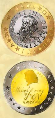 Auf den 1- und 2-Euro-Münzen des Landes (siehe Bild rechts) ist der Autor des ersten Buches in slowenischer Sprache zu sehen sowie der Verfasser der slowenischen Nationalhymne ...