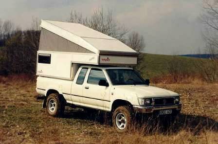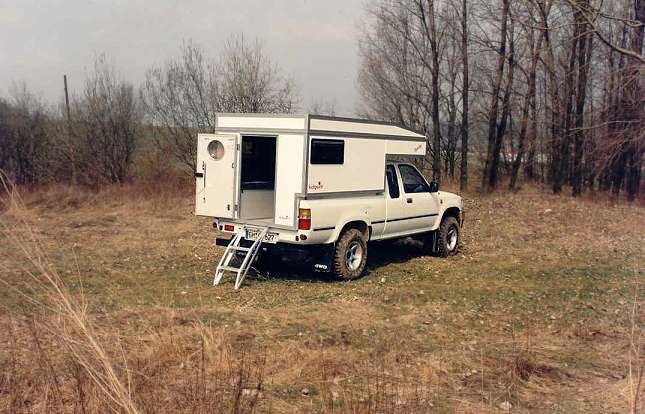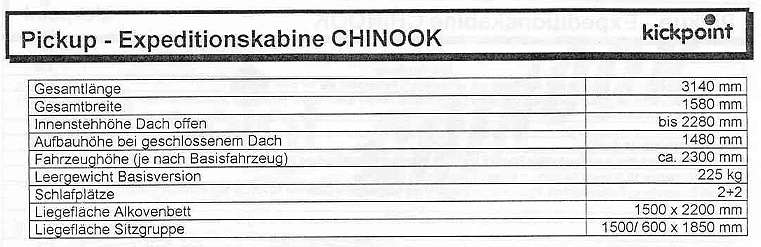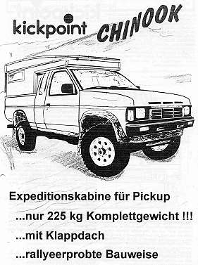 Die besonders leichte und pistenbewährte Expeditions-Klappdachkabine ,"CHINOOK" mit exzellentem Wohnkomfort kann ohne jegliche Umbauten an Fahrzeug und Kabine auf alle Pickups aus japanischer Produktion aufgesetzt werden (Opel Campo, Toyota Hilux, VW Taro 4x4, Nissan King Cab etc.) Auch eine Version für Doppelkabinenfahrzeuge ist im Programm. Eine Kabine ähnlich "Chinook" wird im Herbst ´96 für Land Rover Defender 130 Crew Cab vorgestellt.