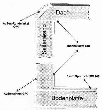 GfK-Sandwichplatten lassen sich wetter- und dauerfest durch Kleben miteinander verbinden. Dazu werden lösungsmittelfreie Spezialkleber auf 2 Komponenten-PU-Basis verwendet. Achten Sie beim Kauf einer Kabine auf die Ausführung der Klebungen! Durch Verwendung von preiswerten und einfacher zu verarbeitenden Einkomponentenklebern läßt sich zwar der Kabinenpreis reduzieren, es muß jedoch mit einer drastischen Verkürzung der Lebensdauer gerechnet werden.
