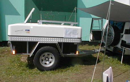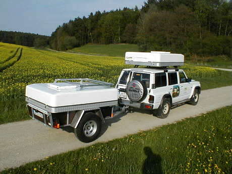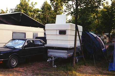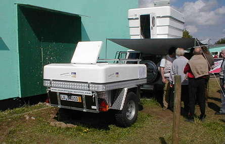 Wie schon angesprochen, war uns die Lösung von Bernhard Finck von der gleichnamigen Firma für Campingsysteme bereits bei der CBR 2001 aufgefallen - die sowohl auf einem Hänger als auch auf einem Fahrzeugdach montierte Dachbox, die wir seinerzeit in Ermangelung einer anderen Bezeichnung als "Kurbelkiste" titulierten.