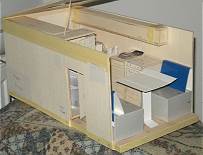 Während der Zeit der Fahrzeugauswahl stand dann auch das Kabinenkonzept in mehr oder weniger groben Zügen bereits fest. Zur Absicherung der Theorie wurde aus Holz ein 1:10 Modell gebaut, inklusive Pappmodelle für die ziemlich unterschiedlichen Abmessungen von Fahrer und Beifahrerin. Dieses Modell mit Klappdach ging dann auch mit auf die Fahrt zu den Ausbauern, die wir in die engere Wahl gezogen hatten.