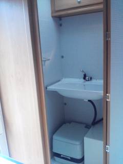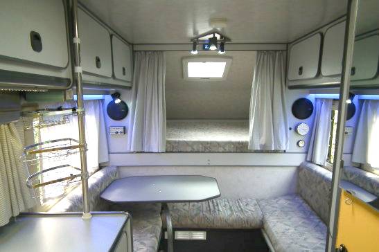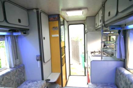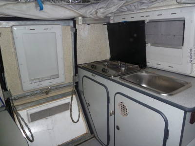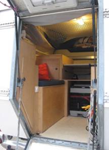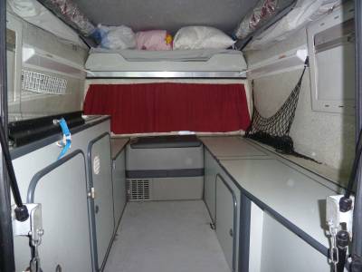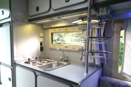 Innen: Zweiflammenkocher, Spüle, Frisch- und Abwasser-Tanks, Radio, Kompressor-Kühlschrank (Schublade, ausziehbar), Zweitbatterie mit Ladegerät, Truma-Heizung, Porta Potti, Utensilienregal, 220V und 12V-Steckdosen, Dach- und Küchenbeleuchtung. Im vorderen Bereich großer Stauraum (beleuchtet) mit großer Außenklappe. Wärmedämmvorhang für den Stoffbalg für innen.