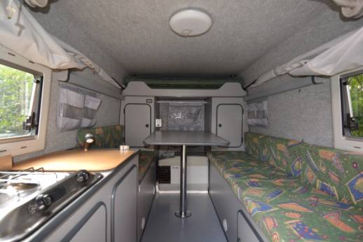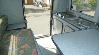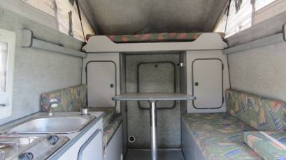 2er-Bett im Hubdach 200 x 135 cm, 2 Kaltschaummatratzen 8 cm dick (erneuert 06/2011), 1,5er-Bett statt Sitzgruppe 200 x 105 (teils 150) cm, Sitzgelegenheiten für 5-6 Personen mit Tisch, 2-Flammen-Gaskocher, Spülbecken mit Warm- und Kaltwasser-Batterie mit Außendusche, 15 L TRUMA-Warmwassertherme gasgeheizt und thermostatgesteuert, 60 L Wasservorrat in 4 Kanistern a 15 L mit 12V-Elektro-Pumpe, Abwasserableitung in tragbarem Behälter außen, TRUMA-Gasheizung mit Umluftgebläse thermostatgesteuert, 3 Sitzstaukästen, 2 Schränke vorne, 2 Küchenunterschränke, großer Stauraum vorne, 3 Seitz-Fenster mit Sonnen- und Insektenschutz, 2 12V-Energiesparleuchten, 230 V-Einspeisung mit automatischem Batterieladegerät 12 V, 1 Steckdose 230 V, 3 Steckdosen 12 V, Alu-Lüftungsklappe (erneuert 08/2011).