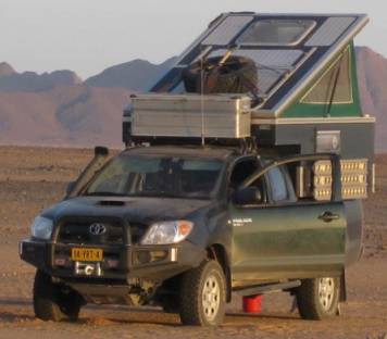 Max. Dachlast: 100kg. Hubdach mit neuem Kanvaszelt. Außen links und rechts Airline Schienen für 2 Treibstoffkanister und 2 Alu Sandbleche (Därr). Ausstellfenster im Dach (60x60 cm) und an den Seiten (70x30 cm) mit Fliegengittern und Rollos. Bett (2.00 x 1.45 m) unter dem Hubdach und Alkoven, Schaumstoffmatratze, Küche mit 2 Flammherd und Spüle, 80L Trinkwassertank (von außen befüllbar), 2 Filter (Zellulose und Aktivkohle). Spüle mit elektr. Pumpe.