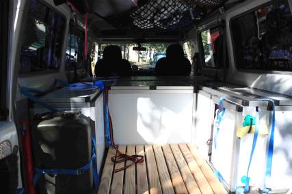 Die Box ist problemlos innerhalb weniger Minuten rauf- bzw. runtergehoben sowie separat abschließbar. An den Seiten ist noch eine Menge Platz für Dinge die ruhig auch mal ein wenig feucht werden dürfen. Wir hatten dort vom Reservekanister über die Müslitonne, den Grill mit Kohle bis zum Tarp inkl. Zubehör untergebracht. Beim ersten Fahrzeug, einem 2004er Ford Ranger, montierte ich einfache Klappen an den Seiten, beim 2012er Ranger eine Plane aus der Haut eines Ally Kanus. Die Plane ist Teil des Verkaufsangebotes.