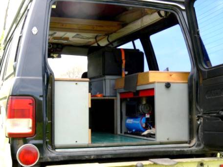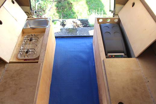 Der Innenausbau ist sehr einfach gehalten und bietet maximalen Stauraum. Es ist eine super funktionierende Waeco 25L Kompressor Kühlbox, sowie ein 2flammiger Gaskocher und eine Spüle integriert. Wasserversorgung mittels 2 x 20L Kanistern mit Tauchpumpe, welche den Wasserhahn und eine Außendusche versorgt.
