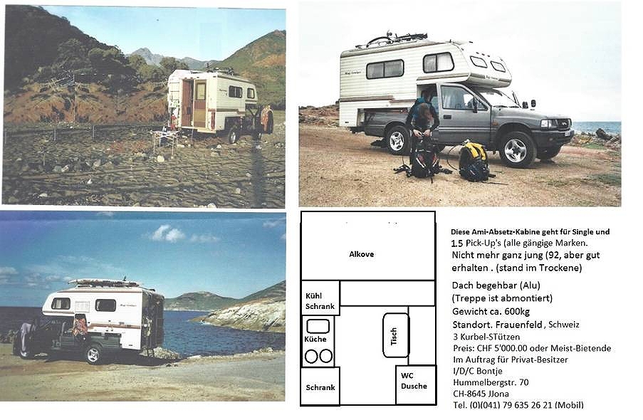 Die Kabine ist sehr leicht und wiegt ca. 240 kg, Bodenmaß ist 100 cm x 225 cm. Max. Breite 163 cm. Damit passt sie auf die meisten handelsüblichen Pick-Up’s mit dementsprechender Ladefläche. Die Kabine befindet sich in einem gebrauchten aber guten Zustand, sie ist dicht und der Zeltbalg ist einwandfrei. Preisvorstellung: VB 4.350,- EUR.