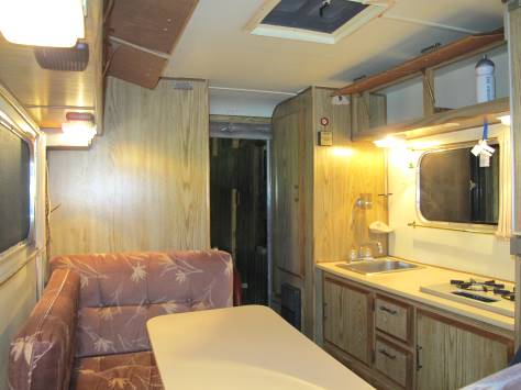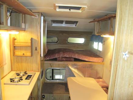 Kabine ist in gutem Zustand. Funktioneller Innenausbau mit vielen Schränken und Staumöglichkeiten. Ausziehtisch, 2-Flammen-Spiritus-Kocher (auch außen verwendbar, da transportabel), leicht entnehmbarer Wasserkanister mit Wasserpumpe, kleines Spülbecken mit elektrischem Wasserhahn, 12 V + 220 V Steckdosen, SAT-Eingangs-Steckdose, Anhängerkupplungs-Stecker 13-polig, Halterungen und Leitung für Solaranlage, Benzinkanister-Halter, Fiamma Außenmarkise, Abstellstützen und Rollgestell.