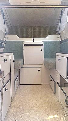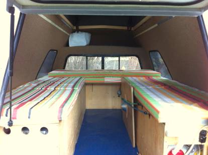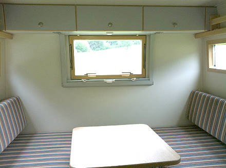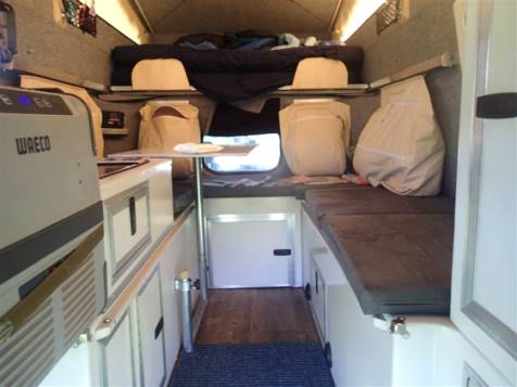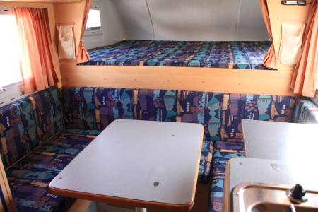 Die Tischplatte kann mit Dreibein-Standfuß im Innenraum und auch als Campingtisch verwendet werden. Sie dient mit einem weiteren Brett zum Umbau in die Liegefläche, welche dann ein geräumiges Bettmaß von 160 cm x 200 cm hat. Die Matratzen sind 2 Jahre alt und kaum benutzt.