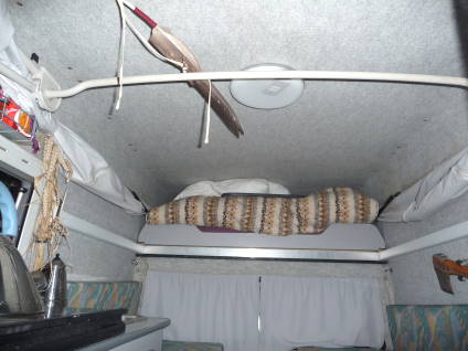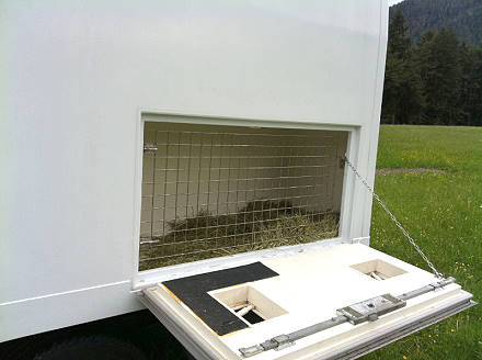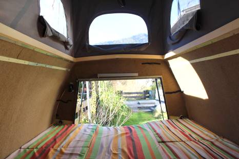 Imprägnierter, verrottungsfester Synthetik-Zeltbalg mit Fenster (Klarsichtfolie), verschließbar mit Reißverschluss mit zwei Moskitonetzen mit Reißverschluss. Zusätzlich originale Thermoplane für Wintereinsatz einknöpfbar. 2 S4 Ausstellfenster, doppelt verglast mit integriertem Kombi-Kassettenrollo. Zusätzlich originale optionale Plexiglasabdeckung außen. Zweiteilige Heckklappe mit S4 Fenster, horizontal geteilt, unterer Teil als Einstiegsstufe ausgebildet. Ausziehbett im Alkoven mit 2,10 m x 1,40 m Liegefläche und Schaummatratze.