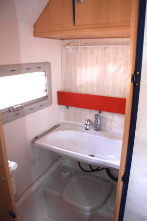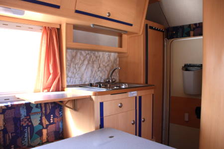 Polster mit strapazierfähigen und pflegeleichten Bezügen, mit Reißverschluss leicht zu öffnen, durch Gaze-Unterfutter leicht abziehbar und waschbar. Sitzgruppe im Wohnbereich mit integrierten Staukästen, Tisch ist optional für ein weiteres Doppelbett umzubauen. Kücheneinheit mit 2-flamm-Edelstahl-Gaskocher und Edelstahl-Spülbecken, hochstellbare Glasabdeckung für den Kocher, nicht brennbar. Ausziehbarer Wasserhahn, als Außendusche verwendbar. 80 lt. Wasservorrat und 10 Liter Abwasserkanister. Möbel aus 7-fach verleimtem Pappelsperrholz, beidseitig kaschiert.