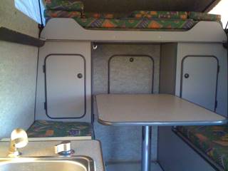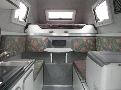 2-flam. Cramer-Gaskocher mit Glasabdeckung, mit 3 KG-Gasflasche 50 mBar, Spülbecken mit ausziehbarer Brause als Außendusche anwendbar, 2 x 10 L Wasserkanister-System, ausziehbares Bett 2 m x 1,40 m mit Alu-Aufstiegsleiter, klappbarer Tisch, Waeco 35-L- Kompressor-Kühlbox 12/24 V, sehr viel Stauraum durch zusätzliche Hängeschränke (Sonderanfertigung), 5 Aufstellfenster mit Fliegengitter und Verdunklungsrollos, zusätzlich angebrachte Gepäcknetze, zusätzliche Ausziehleiter, Truma F5 Gebläseheizung mit Thermostat und Außenkamin an der Seite.