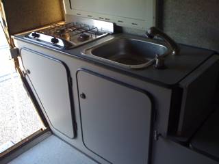Küchenzeile vorne quer mit Herd und Spüle, Kühlschrank Druckwasseranlage, neuer Batterie und Ladegerät, Heizung, Radio, Porta Potti, Dachreling usw.