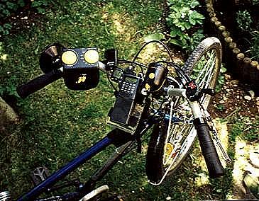 Um aus einem Durchschnittsfahrrad ein voll "langtourenfähiges Superbike" zu machen, wurden natürlich noch etliche Mark zusätzlich investiert. Als mir der Dynamo zum wiederholten Male mitten in der Nacht den Dienst verweigerte, schaute ich mal in meinem Lieblingsgeschäft Lauche & Maas vorbei. Dort erstand ich mein "Vista Lite": einen 10 W Halogenstrahler mit einem 2,5 Ah Akkupack - damit leuchte ich mindestens einen ganzen Waldweg aus. Und auch die Autofahrer schalten neuerdings ihr Fernlicht ab, wenn sie mir mitten in der Nacht auf einsamer Landstraße entgegenkommen!