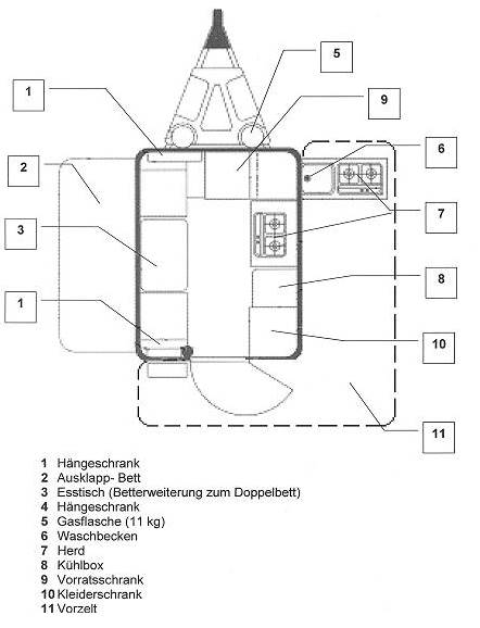 Die ausklappbare Küche (6 / 7) befindet sich jetzt vorne und wurde mit dem Kleiderschrank (10) getauscht, was bei der Verwendung des Vorzeltes (11) auch Sinn macht. Außerdem konnte dadurch innen vor dem Fenster ein kleinerer zweiflammiger Kocher (7) untergebracht werden.