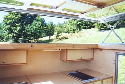 Vor sich auf dem Dach hat der fleißige Koch noch einen Streifen Riffelblech, auf dem heiße Töpfe abgestellt werden können - so steht bei schönem Wetter eine vergrößerte Arbeitsfläche zur Verfügung. Die Wirkung ist die einer Außenküche, ohne dass die Arbeitsgeräte immer rein- und raus geschleppt werden müssen. Um diese große Arbeitsfläche werden wir von draußen auf Provisorien arbeitenden "Mitkochern" regelmäßig beneidet.
