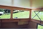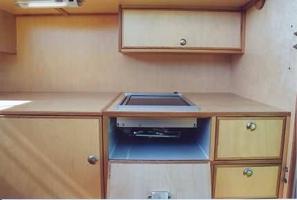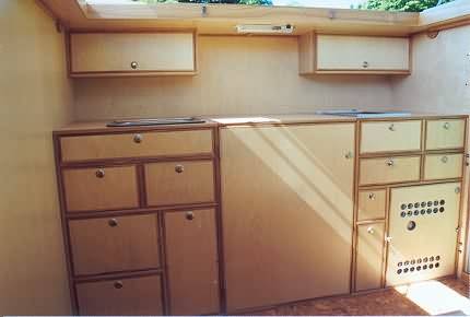 Die gesamte Inneneinrichtung besteht aus Birke-Multiplexplatten in einer Stärke von 15 mm. Die Umleimer sind aus massiver Waldesche. Alles nicht benötigte Material ist ausgeschnitten - dadurch haben die Möbel das Gewicht von vielleicht 6 mm Platten, aber die Festigkeit von 15 mm.