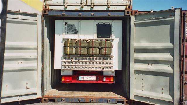 Das Fahrzeug ist damit um 24 cm niedriger und passt genau in einen Standard 20"-Container mit 229 cm Einfahrtshöhe und einer Türöffungsbreite von 234 cm (die maximale Fahrzeugbreite des DUSTDEVIL-Bremach - mit eingeklappten Außenspiegeln - beträgt 200 cm) - beste Voraussetzung also für die große Reise ...