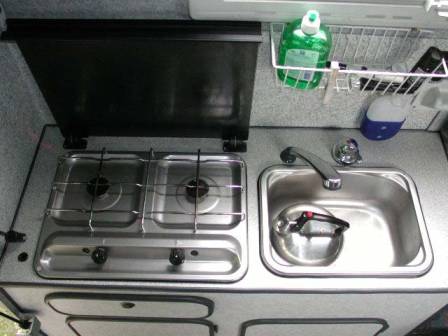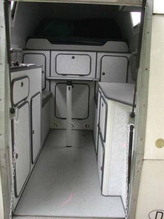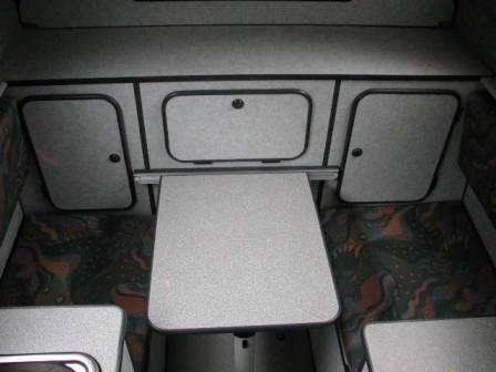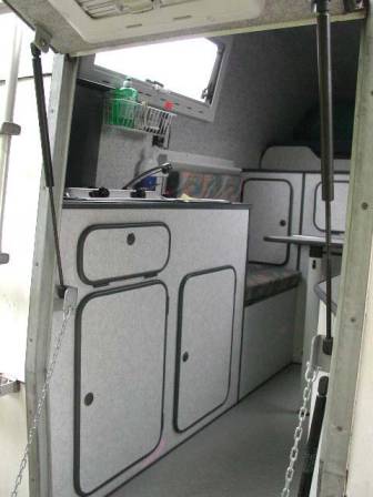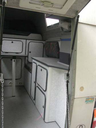 Die Inneneinteilung hat mein Vorbesitzer beim Neukauf im Jahr 2000 auf seine Bedürfnisse hin maßschneidern lassen: Die Kabine ist ausgerichtet auf einen reinen 2-Personen-Einsatz und verfügt über viiiiiel Stauraum. Deshalb fällt die normale Längsbank auf der rechten Seite weg: Dort ist stattdessen ein Schrank, die Gasflasche und eine Kühlbox. Sitzplätze gibt´s nur zwei. Das Bett ist mit einer Breite von 1,40 und einer Länge von 2,10 m großzügig.