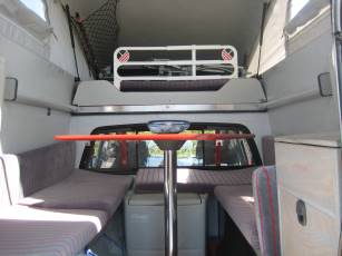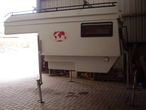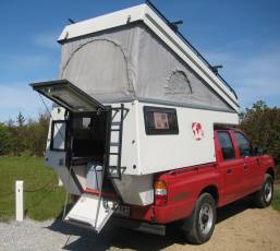 Aeroplast Explorer Aufsetzkabine mit schrägem Heckeinstieg (durch die Schräge keinerlei Probleme beim Einparken im Stadtverkehr, sowie guter Böschungswinkel). Begehbares, verstärktes Dach mit Dachreling und Surfträgern, Kederschienen Rechts und Hinten zur Nutzung von Sonnensegeln. Der Ausbau ist einfach aber zweckmäßig, Schlafgelegenheit für 4 Personen, Bett oben ausziehbar. Kleiner Küchenblock mit Kartuschenkocher, Gasgrill mit Propan, Kühlbox (12 V, 220 V, Gas) Tisch mit Wechselfuß für Innen und Außen. Elektroanschlüsse für 220 V und 12 V, Gelbatterie.