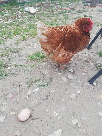 sich entfernen wollen, sehe ich, dass eines der Hühner zum Dank ein Ei neben