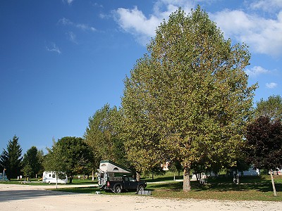 Früh morgens um 6 Uhr sind alle am Platz wach (wir und die Besatzung eines schwedischen Womos als einzige Gäste). Wie in Frankreich üblich, ist eine Hütte an Handwerker vermietet worden, die in aller Herrgottsfrühe abgeholt werden zu ihrem Einsatz an einer Baustelle. Einer dieser Handwerker hat offensichtlich verschlafen und der Fahrer des Busses meint, nur Dauergehupe kann dem Mann aus dem Bett helfen. Endlich - nach einer guten Viertelstunde - stürzt der Langschläfer aus der Hütte in den Bus und das Dauergehupe hört auf. Unsere Rufe, man möge mit dem Gehupe aufhören, werden während dieser Zeit natürlich nicht gehört - es ist ja ziemlich laut ... Doch endlich kehrt wieder Ruhe ein und schläfrige Stille macht sich breit auf dem Platz.