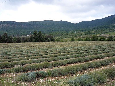 Von Zeit zu Zeit gibt sich die Sonne alle Mühe, das Rhônetal mit seinen Lavendelfeldern schön zu beleuchten. Vielleicht gibt es ja auf dem Platz ein windgeschütztes, schattiges Eckchen für uns - und ein Schlückchen guten Rotwein, für den am Straßenrand geworben wird.