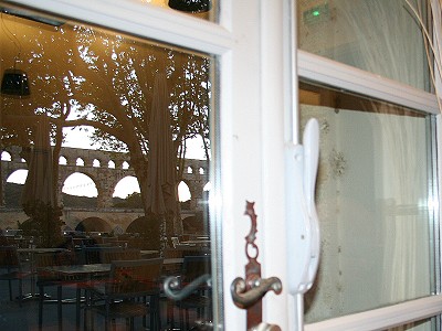 Ein Besuch im nahegelegenen Restaurant ist zu empfehlen: Zum einen hat man den herrlichen Blick auf den Pont, zum anderen erfreuen die Köstlichkeiten der Küche. Wir haben noch Glück und können einer Gruppe von Vermessern(?) Statikern(?) Bauingenieuren(?) oder Archäologen(?) zuschauen, die auf dem obersten Bogengang mit viel Gerätschaften arbeiten.