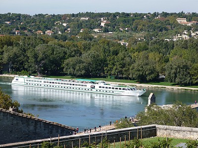 An der Rhône liegen endlos lange Dampfer, mit denen die Touristen der Flusskreuzfahrten durch die Provence geschippert werden. Avignon ist da ein fester Ausflugspunkt mit Landgang.