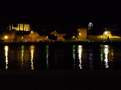 Zum Abschluss gibt es ein Abendessen in einem Gartenlokal direkt an der Rhône: Man kann es aushalten, denn der Mistral hat eine Pustepause eingelegt. Bei einem guten Essen mit einem schönen Rotwein kann man den Blick auf das beleuchtete Avignon auf der anderen Seite der Rhône genießen.