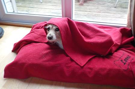 Die leichte Decke sorgt für eine angenehm warme Temperatur. Unser Bild unten zeigt sie in dieser Situation, alles von ihr ist bis auf den Kopf bereits abgeschaltet. Sie schaut trotzdem wachsam, ob wir noch irgendetwas vorhaben, denn dann wäre sie sofort wieder dabei. Selbst, wenn ihr dann vor Müdigkeit die Augen zufallen sollten ..!