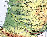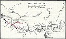 Zur Bezeichnung "Kanal der zwei Meere" ist eines sofort auf unserem Bild oben links zu erkennen: Der Canal du Midi, der vom Mittelmeer bei Sète über Agde, Béziers und Carcassonne bis Toulouse verläuft, schafft gemeinsam mit dem Canal de Garonne von Toulouse aus bis Bordeaux eine Verbindung zum Atlantik.
