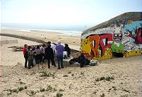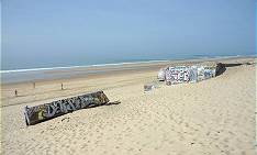 Ein herrlicher, fast leerer vorsaisonaler Strand erwartet uns: Im Sand stehen noch Relikte der deutschen Besetzung im Zweiten Weltkrieg, als dieser Abschnitt hier zum Atlantikwall gehörte. Zwar wurden die Bunker einst gesprengt, doch die geborstenen Teile sind nun fester Bestandteil des Strandes.