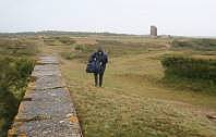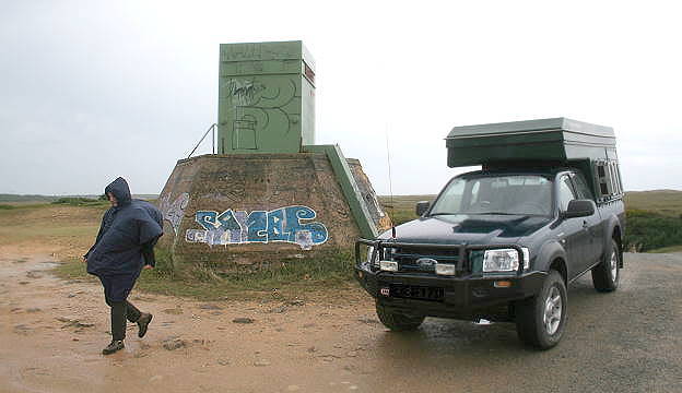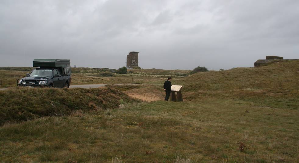 Nach kurzer Fahrt über eine alte Militärstraße in ein Dünengelände Richtung Meer kann man nach wenigen Minuten am Sockel der ehemaligen Radarstellung vom Typ "Würzburger Riese" in der Nähe des Hochleitstands der Batterie parken. Heftiger Wind, einzelne letzte Schauern und eine tief hängende Bewölkung geben dem ganzen Areal eine beklemmende Atmosphäre und man weiß nicht so recht, weshalb genau hier dem Betrachter der eine oder andere kalte Schauer den Rücken herunter läuft ...