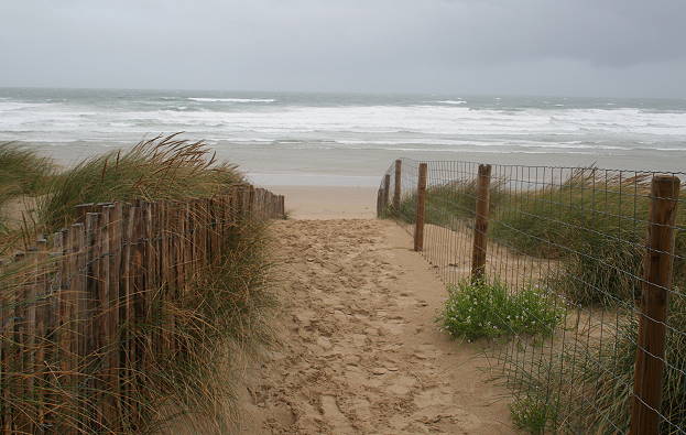 Beim heutigen Wetter wirkt es auch nicht tröstlich, den kurzen Weg Richtung Strand weiter zu fahren und hier über einen Dünenweg in Richtung Meer gehen zu können: Im Atlantik brodelt die Gischt, der Wind pfeift scharf herüber und man möchte hier und heute nicht unbedingt von See her einen Landungsversuch machen - selbst wenn man dabei nicht unter Beschuss gerät ...