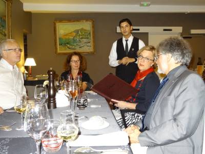 Auch hier hat man ein mehrgängiges Menü für uns vorbereitet, doch leider keine Menükarten, so dass man dem Kellner sehr genau zuhören muss, um zu wissen, was einen auf dem Teller erwartet. Das Essen ist geschmacklich eher puristisch, keine Explosionen von Gewürzkombinationen, sondern intensiver Geschmack des jeweiligen Grundprodukts. Nicht bei allen Teilnehmern findet diese Zusammenstellung den gewohnten Anklang. Zusammen mit dem Sommelier wählt Gerhild als Weißwein Le Clos des Vignes von Domaine Gardiès aus 2013 (Grenache blanc, Grenache gris, Macabeu, Roussanne) und als Rotwein Quadratur von Coume del Mas aus 2011 (Grenache, Mourvèdre, Carignan) - wie üblich eine perfekte Weinbegleitung.